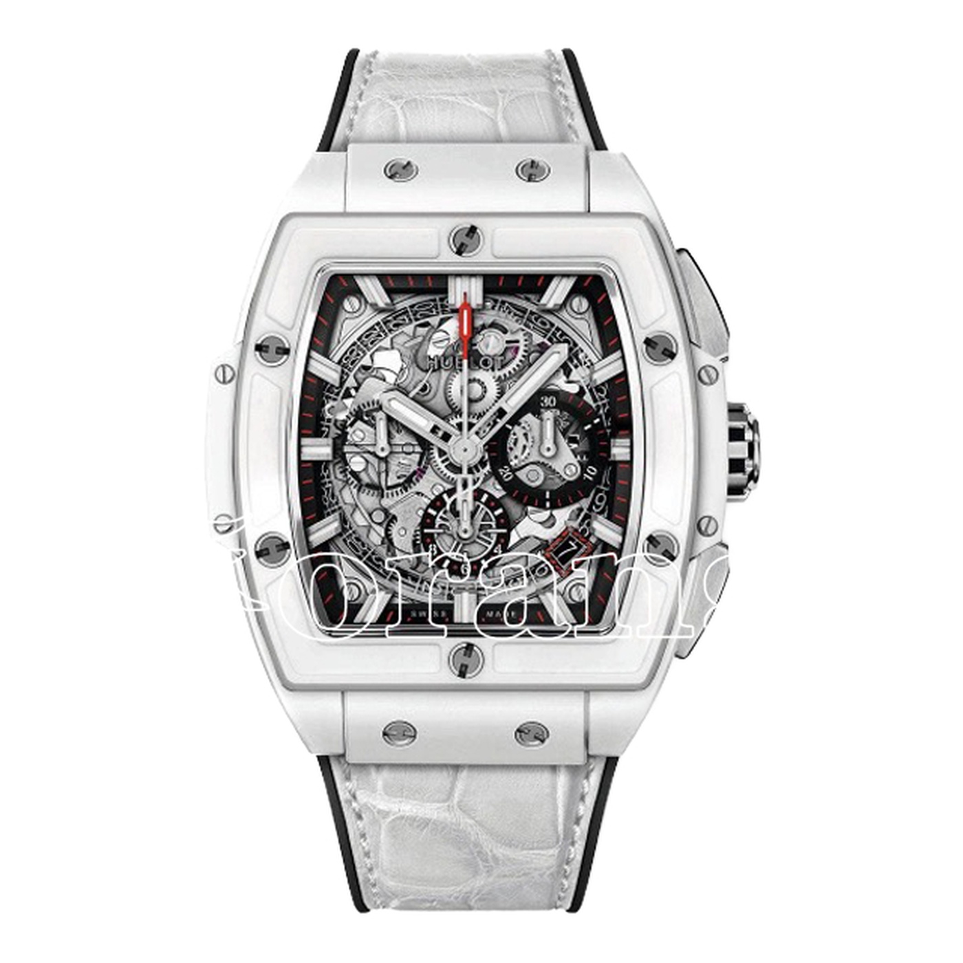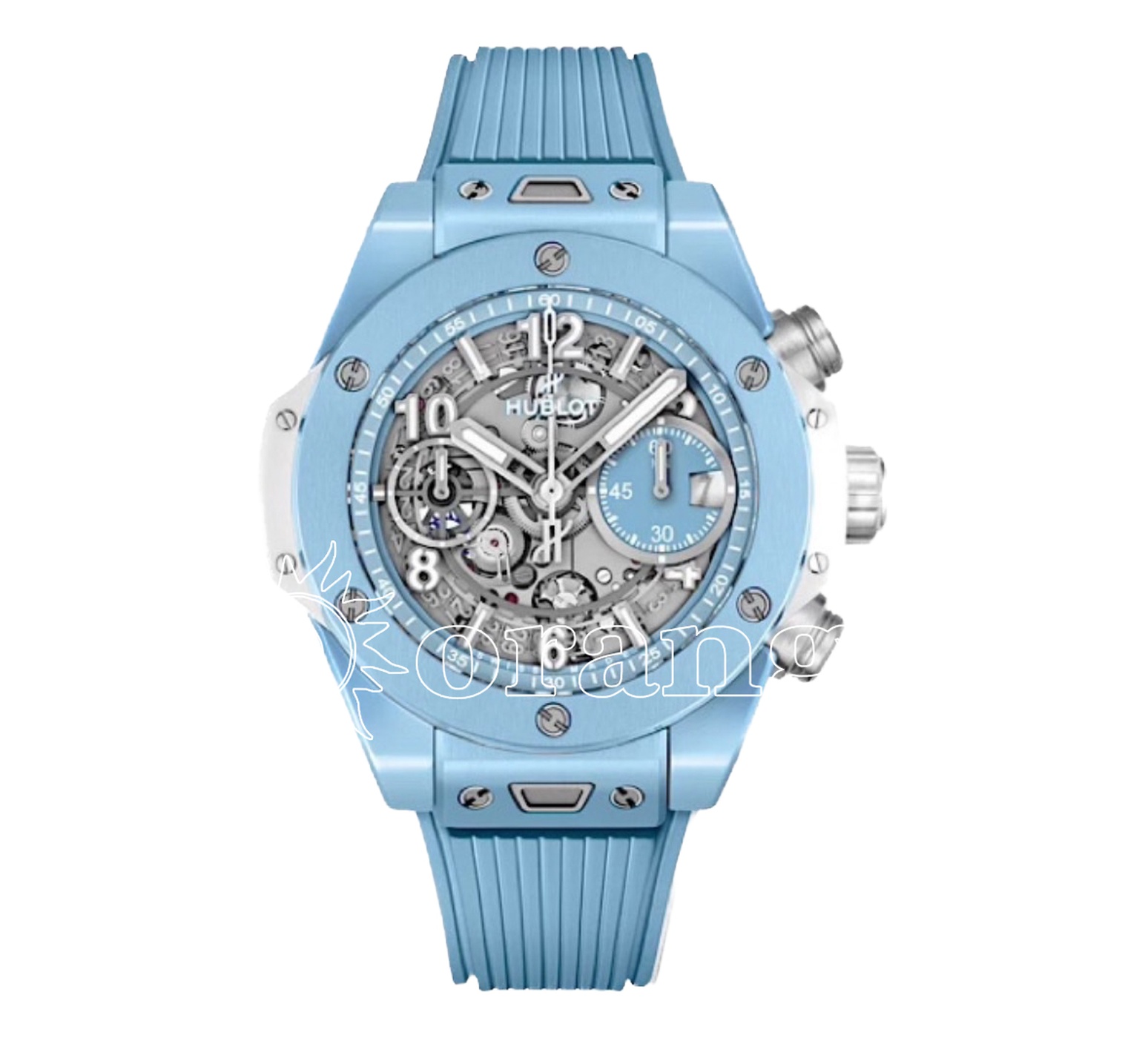 ホワイト&ライトブルーのライン入りラバーストラップ 、ホワイトのカーフ&ベルクロ | スケルトン