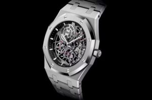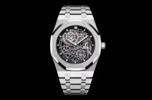 このモデルは、39mmのホワイトゴールドケースに、わずか8.1mmという極薄設計を採用。ケースやブレスレットにはサテンとポリッシュを巧みに組み合わせた仕上げが施され、独特の高級感と軽快さを演出しています。オープンワーク(スケルトン)仕様の文字盤からは、精緻に仕上げられた内部構造が露出しており、時計というよりも芸術作品と呼ぶにふさわしい外観です。