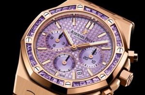 38mmのピンクゴールドケースに、32個のバゲットカット・アメジストをセットしたベゼルが特徴的。文字盤は鮮やかなパープルで、「グランド・タペストリー」パターンが織りなす立体感が魅力です。ブレスレットも同素材で統一されており、ジュエリーとしての存在感も十分。見る者を圧倒するラグジュアリー感を放ちます。