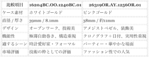 どちらも高価格帯に位置するラグジュアリーウォッチですが、それぞれの美学と個性がはっきりしているため、「何を求めるか」が明確な方には、理想的な選択肢となることでしょう。