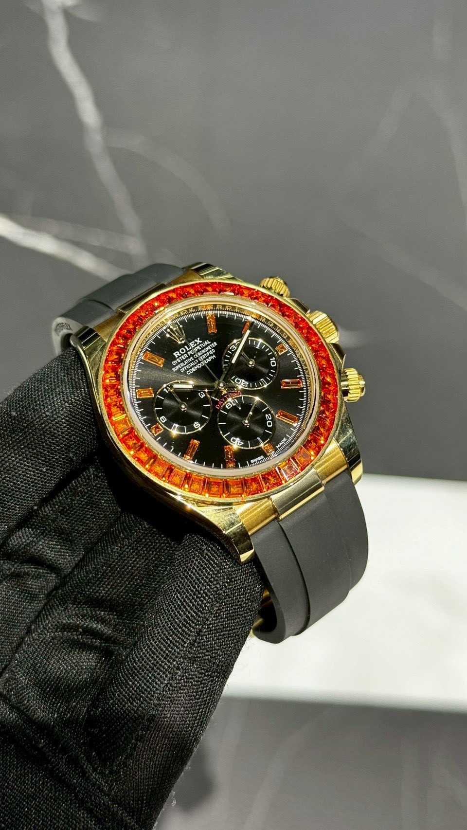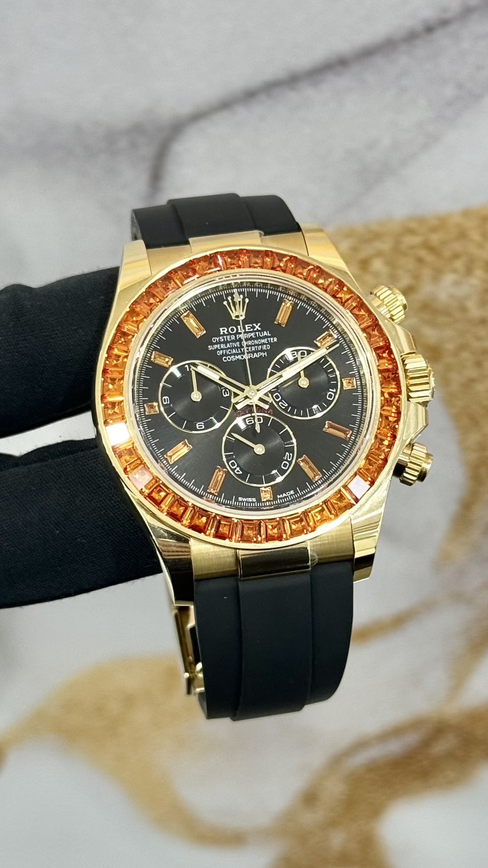 116588SACOは、ロレックスのコスモグラフ デイトナの中でも、ベゼルに配したコニャック(オレンジ系)サファイアが強烈な個性を作る宝飾リファレンスです。ブラックダイヤルを背景に、暖色の石が輪郭として立ち上がるため、写真より実物で“刺さる”タイプ。宝飾デイトナの魅力が「派手さ」ではなく色合わせと統一感にあることを、分かりやすく体現した1本です。