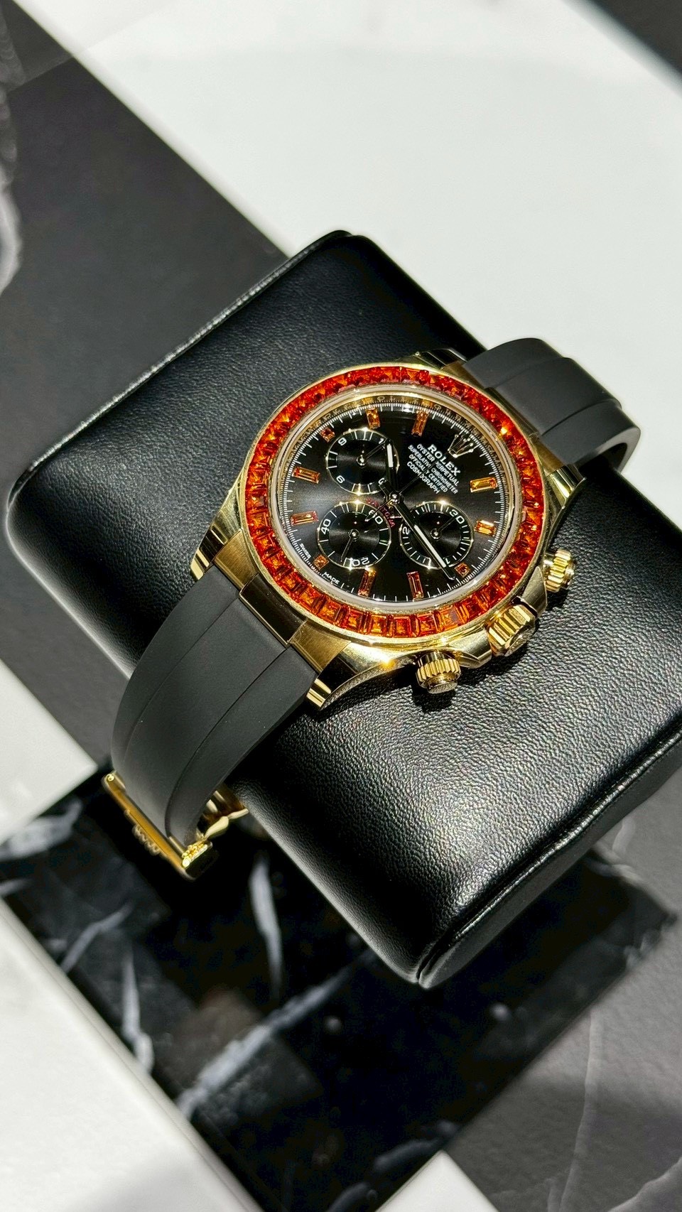 116588SACOは、ベゼルの36石コニャック系サファイアとブラックダイヤルの対比で、“色で惹きつける”宝飾デイトナです。