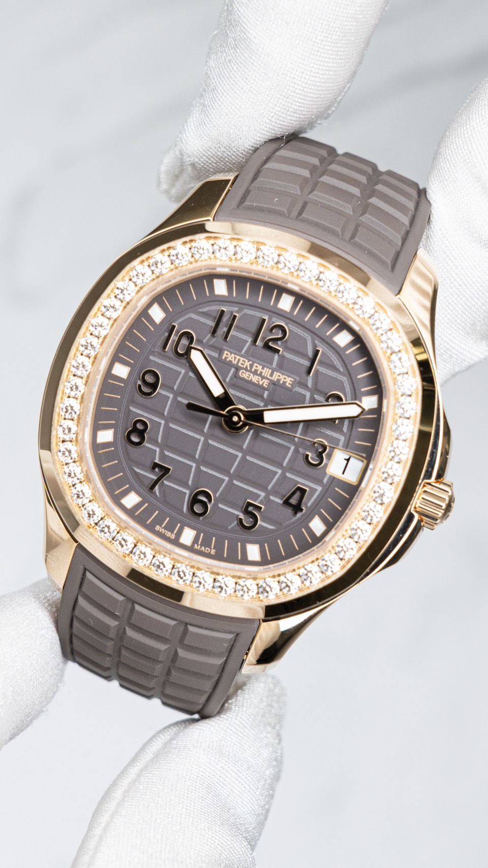 - 文字盤は落ち着いたトープ系カラーに、アクアノートらしいパターン表現。明るすぎず暗すぎずで、服に合わせやすい方向。