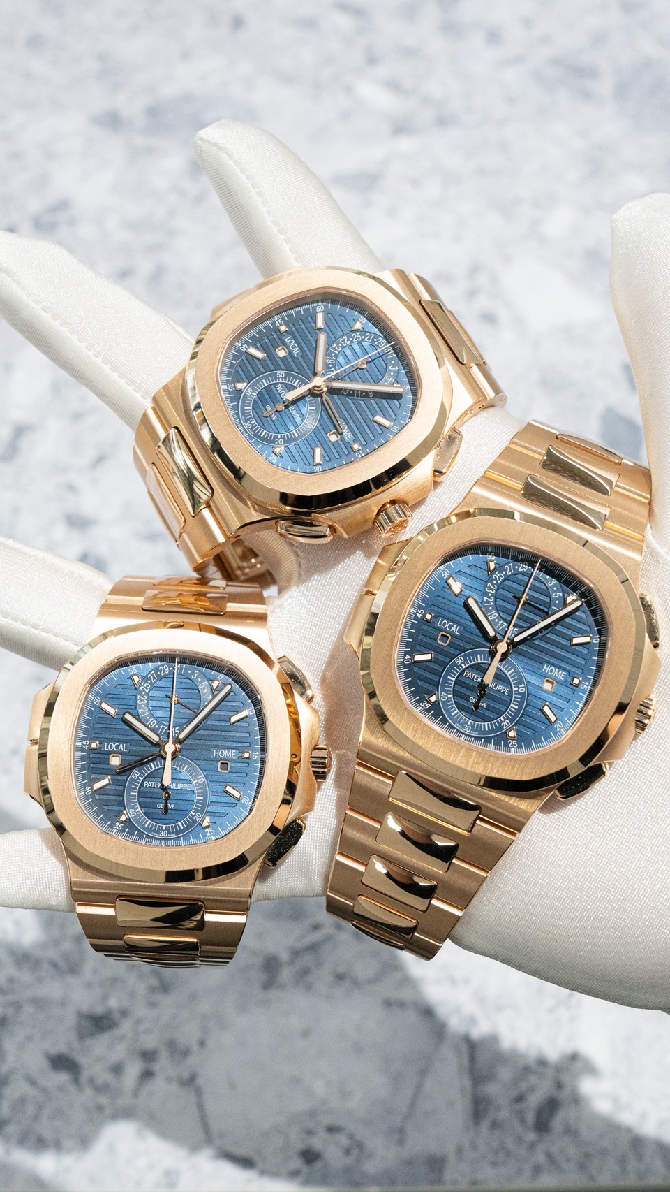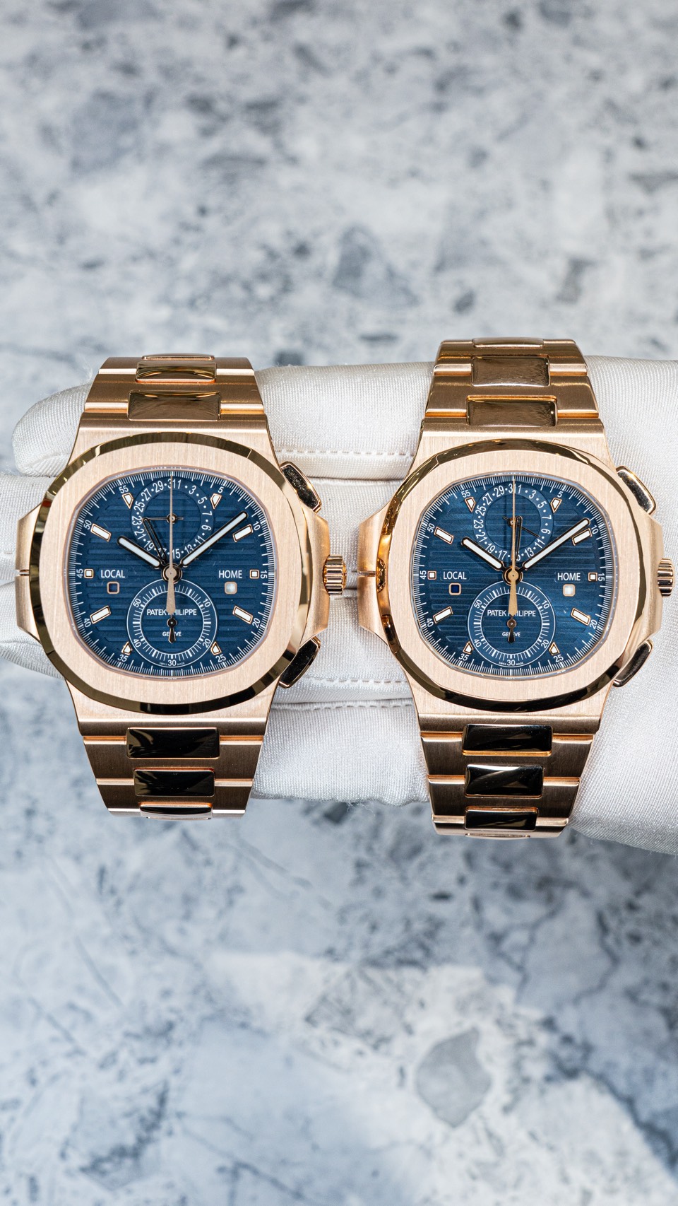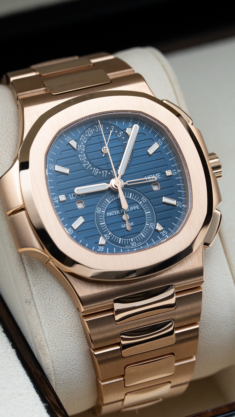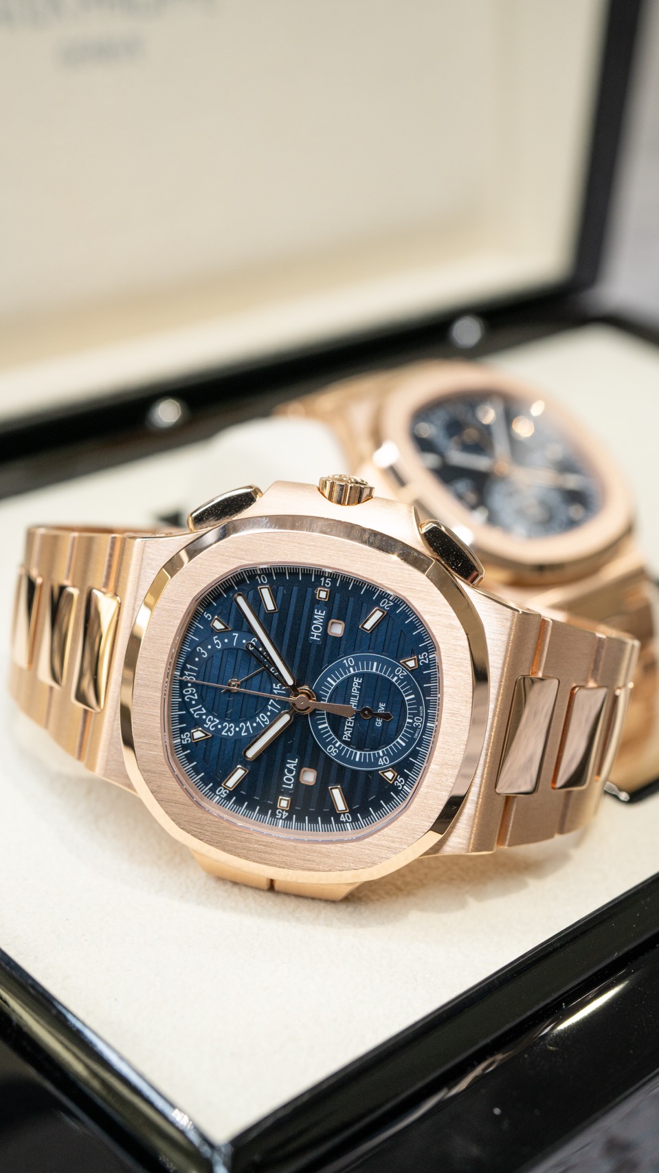 ノーチラスの中でも、実用性の“完成度”で別格といわれるのがトラベルタイム・クロノグラフ Ref.5990。なかでも5990/1R-001は、ローズゴールドのケース&ブレスレットに、水平エンボスのサンバーストブルーダイヤルを組み合わせたラグジュアリーと機能美の両立モデルです。
