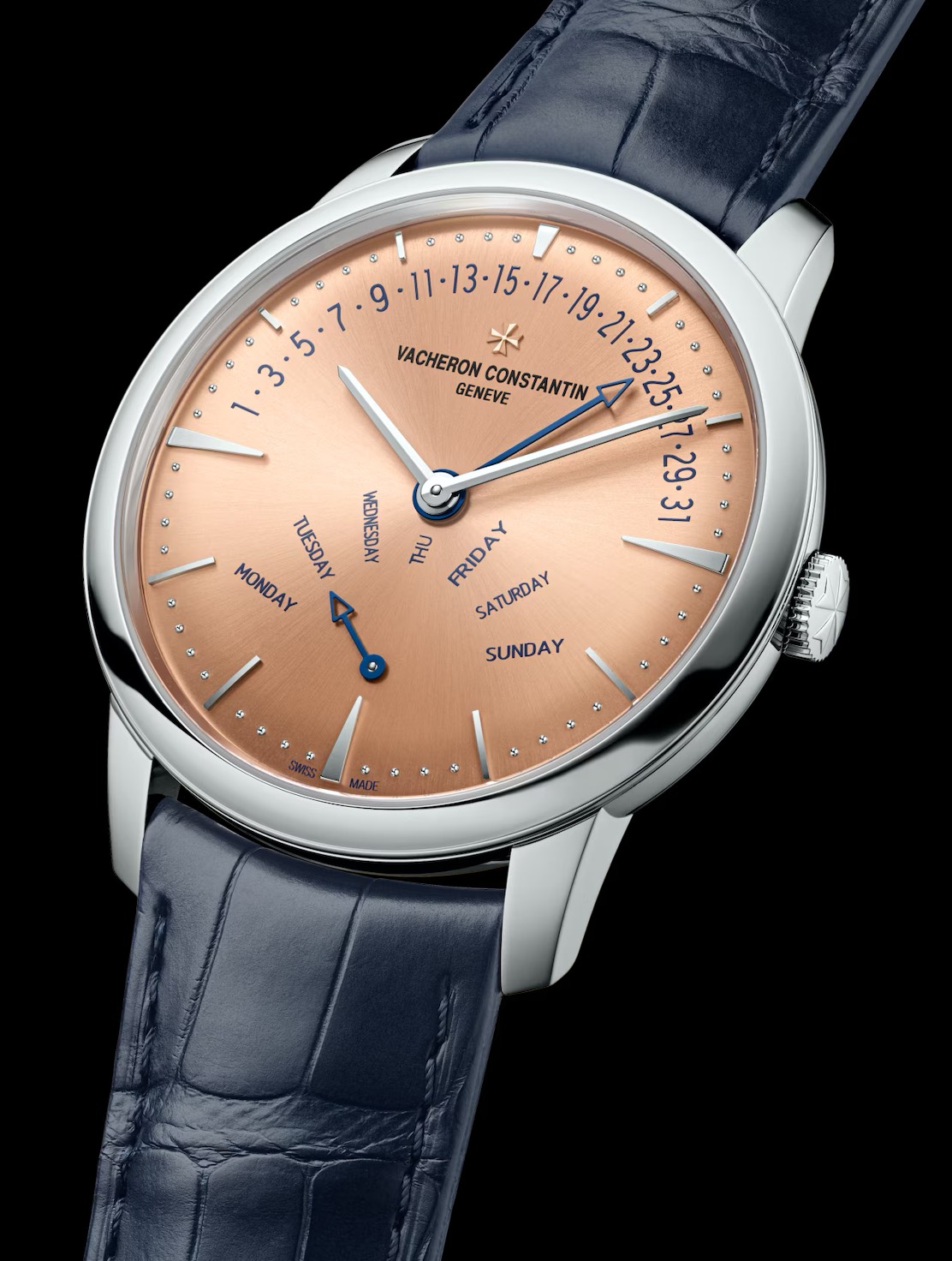 950プラチナケースに、サーモントーンのサンバーストサテン仕上げダイヤル。ブランド側も「プラチナケースに結びつけられる、専用性の高いダイヤルカラー」として位置づけており、“控えめに特別”を狙う一本です。曜日/日付針はブルースチールで、サーモン地に凛とした緊張感が乗ります。ストラップはダークブルー、バックルもプラチナ。