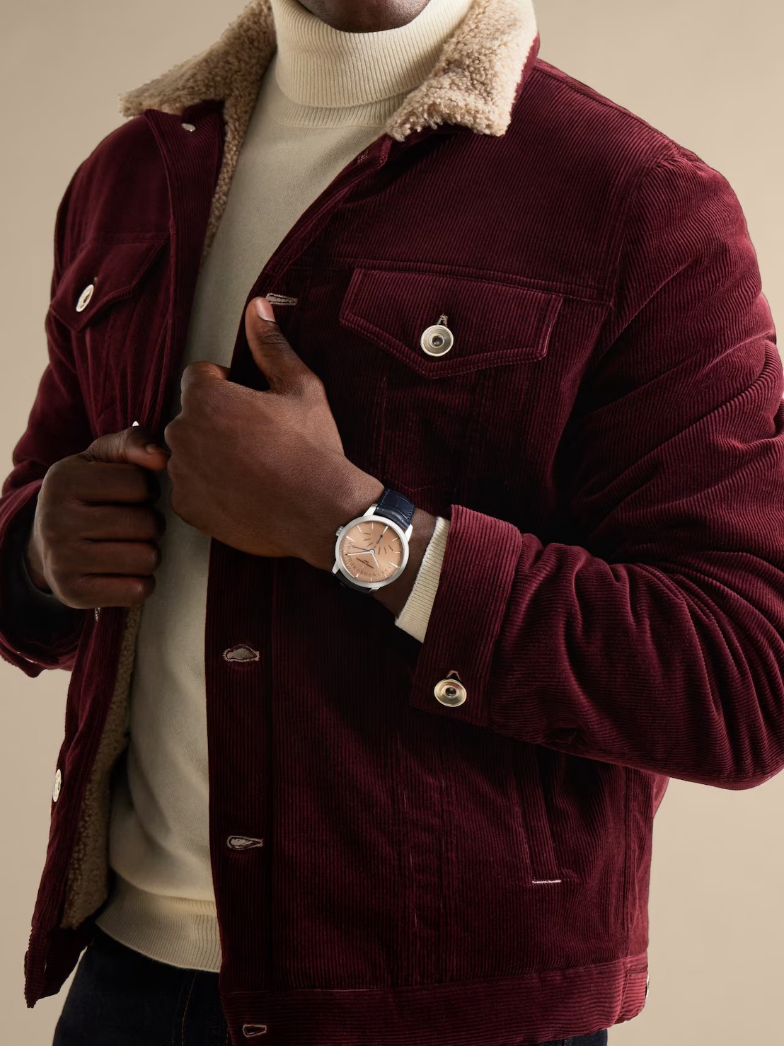 ピンクゴールド×ミッドナイトブルーは、照明下での映えが強い王道。夜の会食・パーティー・ジャケットスタイルに寄せたい人向きです。