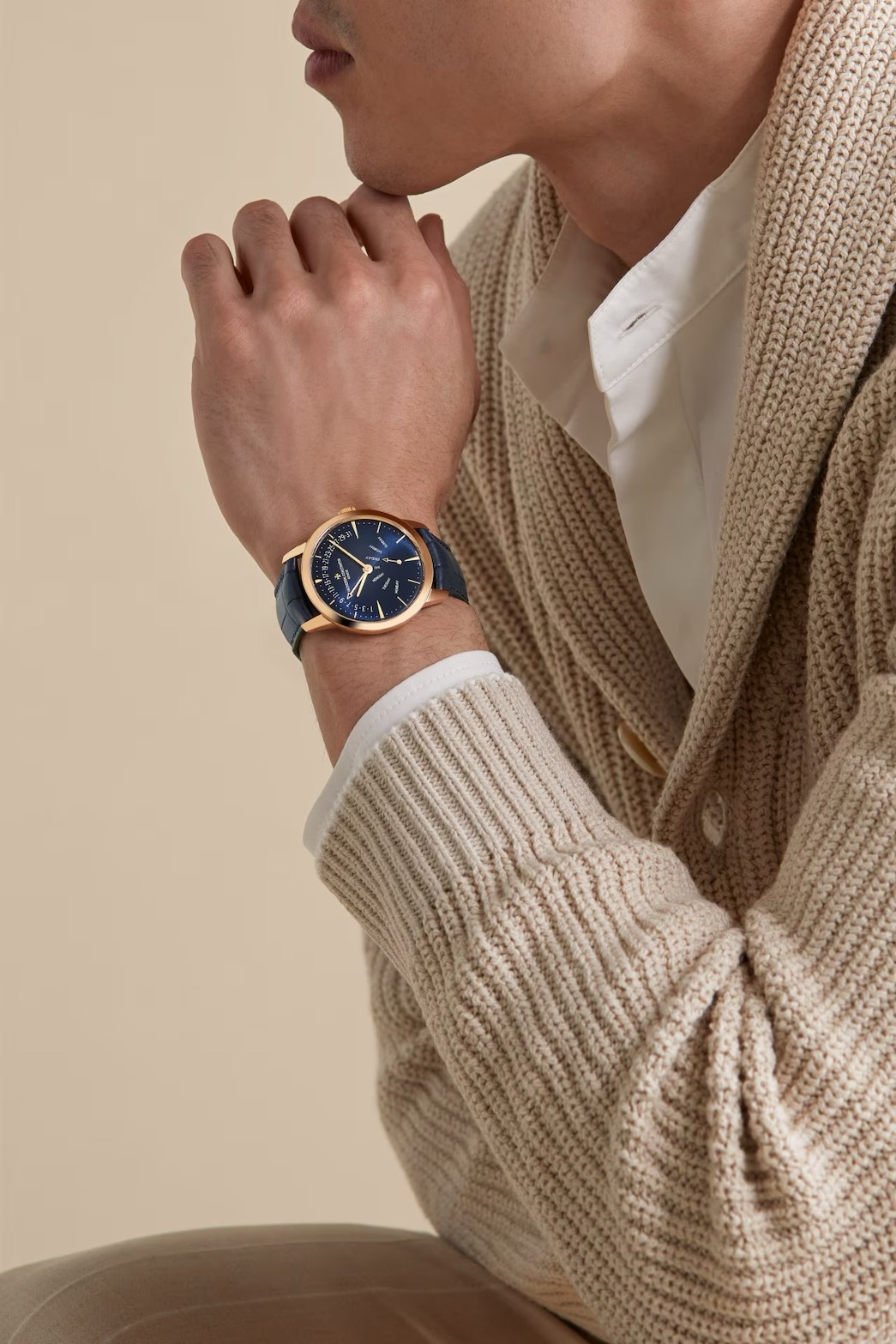 意匠面では1950年代のデザインに着想を得たインデックス/針を掲げ、柔らかなダイヤルカーブに沿って端正に整列。パトリモニーらしい“引き算のエレガンス”を保ったまま、複雑機構の存在感を上品にまとめています。