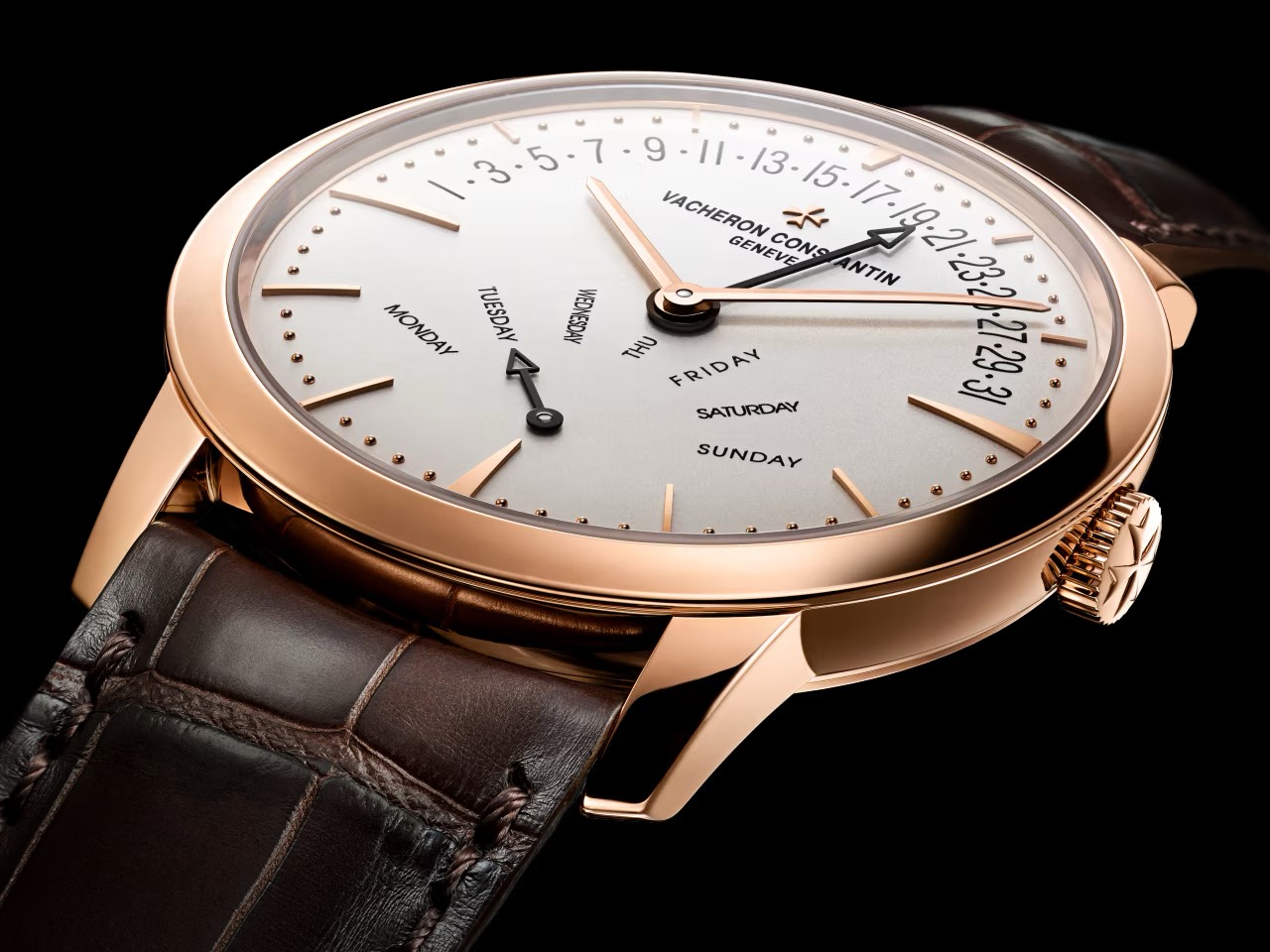 同じピンクゴールドでも、ダイヤルはシルバートーンのオパーリン。よりクラシックで昼間の光に映え、スーツにも式典にも寄せやすい“万能系ドレス”に寄ります。日付針はブラック仕上げのゴールド針として示され、コントラストで視認性も取りやすい設計。ストラップはブラウン、バックルはピンクゴールドです。