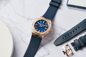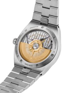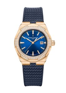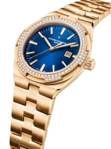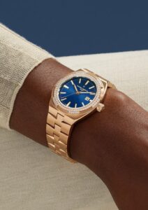 こちらは35mm径の18Kピンクゴールドケースを採用し、ベゼルに90個のダイヤモンドを配したラグジュアリー仕様。ブルーダイアルと透明なケースバックを備え、ムーブメントはCalibre 1088/1を搭載。付属する3種類のストラップ(メタル・レザー・ラバー)は工具不要で簡単に交換可能です。