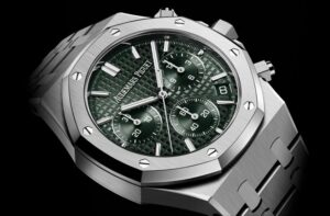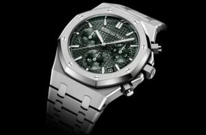 このモデルは41mm径のステンレススティール製で、カーキグリーンの「Grande Tapisserie」ダイヤルを特徴としています。ステンレスベースのケースとブレスレットは、ロイヤルオークの伝統的な八角ベゼルと上品な光沢を併せ持つ仕上げが魅力です。防水性能は50mで、日常においても十分な堅牢性を備えています。