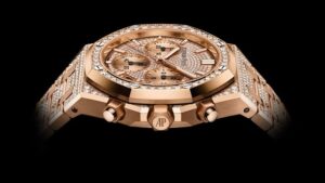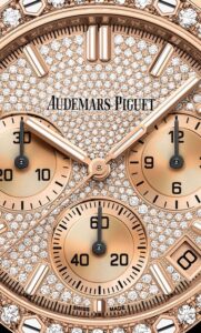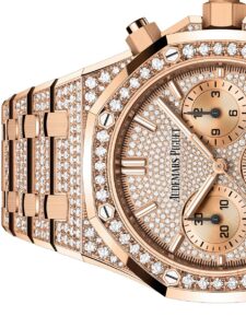 41mmのローズゴールドケースに加え、ケース、ベゼル、ダイヤル、ブレスレットまですべてブリリアントカットダイヤモンドで覆われた極めて華やかな仕様です。ダイヤモンド総数は非常に多く、合計で約8カラット以上。防水性能は20mとなっています。