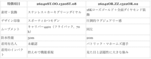 進化を遂げるオーデマ・ピゲ「ロイヤルオーク」シリーズに、新たな2本が登場しました。一方はステンレス×カーキグリーンの「26240ST.OO.1320ST.08」、もう一方はローズゴールド×ダイヤモンド全装飾の「26242OR.ZZ.1322OR.02」。どちらも41mmクロノグラフですが、その趣きはまるで別世界のよう。この記事では、両モデルのデザイン、技術、そして選び方のポイントを徹底比較し、“あの人も?”という着用情報も交えて、あなたにとって“運命の1本”を選ぶお手伝いをします。