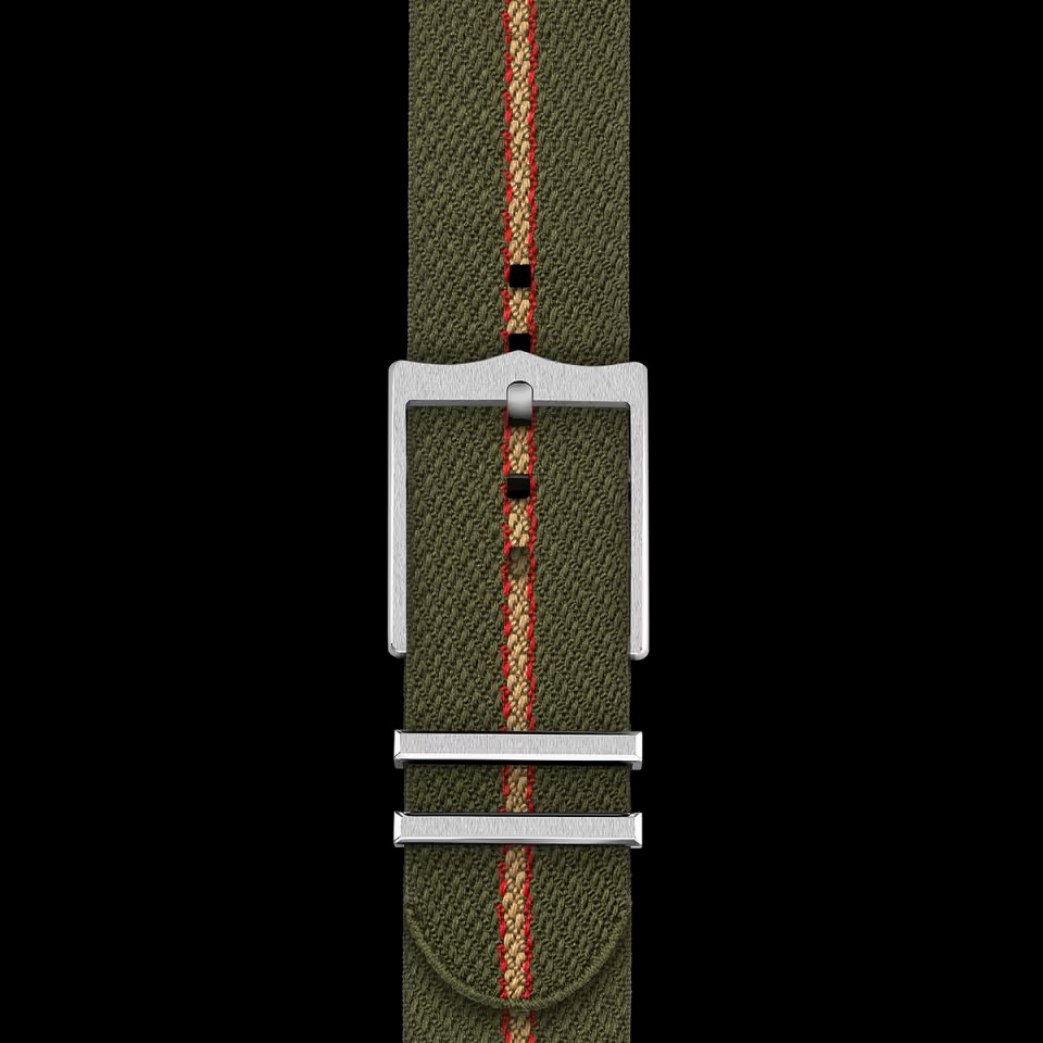 「レンジャーらしい道具感」を、最もコンパクトに楽しめるのがこの1本。ブラックのドームダイアルに、グリーン基調のファブリックを合わせた構成です。