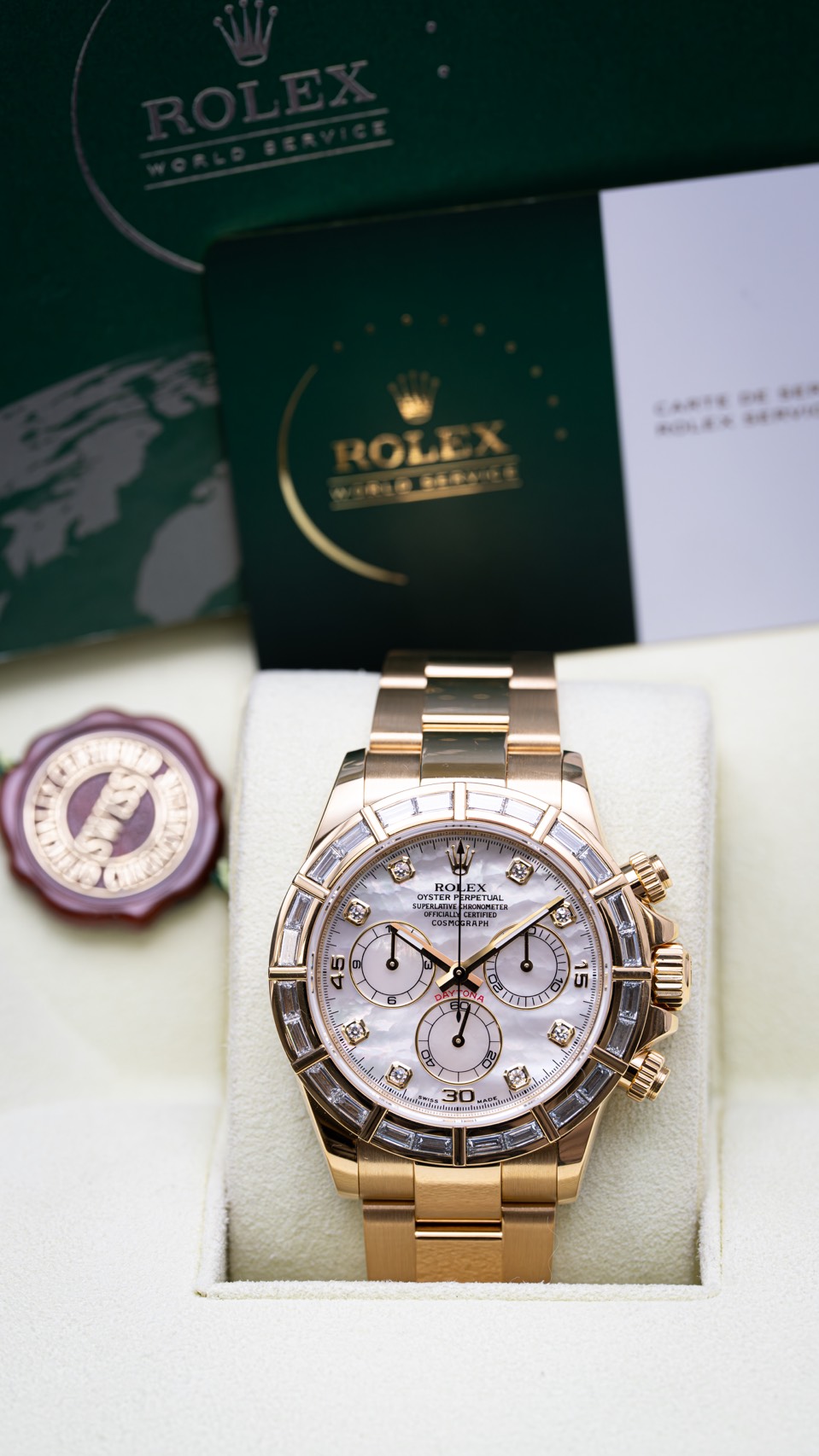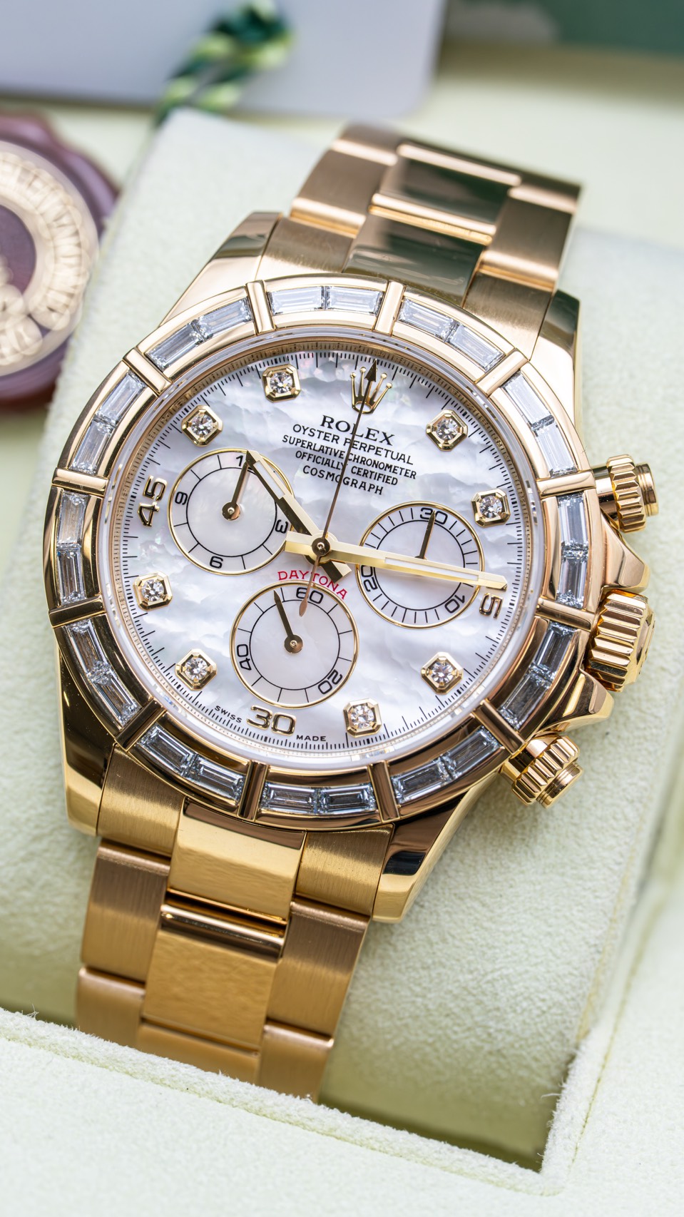 K18イエローゴールドの重量感、バゲットダイヤを敷き詰めたベゼル、そして天然素材であるホワイトシェル文字盤。スポーツクロノグラフという枠を超え、“身に着けるラグジュアリー”として完成したデイトナといえます。