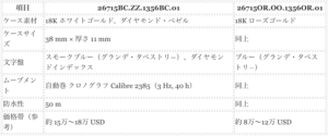 ムーブメントは同じく「Calibre 2385」。機能と性能は26715BCと共通ですが、素材と装飾が異なることで、異なる雰囲気と魅力を放ちます。市場での販売価格もおおむね8〜12万ドル台。