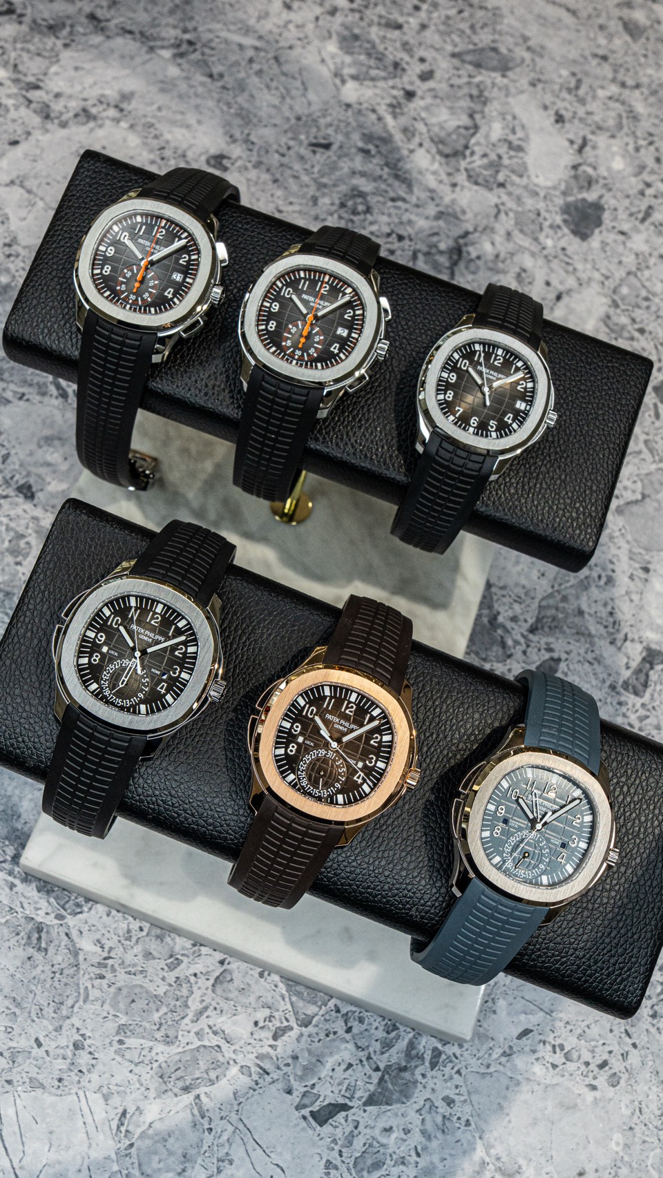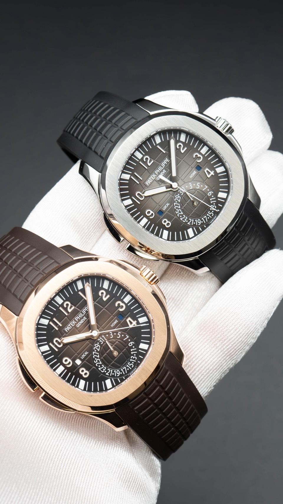 - 5164R:公式にはサンバースト・ブラウン+アクアノートパターン、ローズゴールド植字+夜光、ブラウンのコンポジットストラップ。