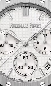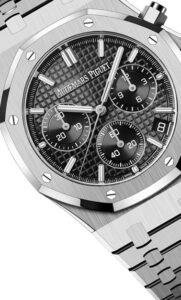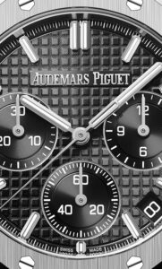 このモデルは、ブラックカラーのグランド・タペストリーダイヤルを採用しています。サブダイヤルとのコントラストがはっきりしており、クロノグラフの読み取りがしやすいのが特長です。ホワイトゴールド製のアプライドインデックスと夜光付き針が高い視認性を確保し、日中でも夜間でも安定した視認性を提供します。