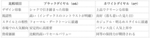 シックで男性的な印象を求めるなら、ブラックダイヤルの06がおすすめ。一方、洗練されたエレガンスや明るい印象を求めるなら、ホワイトダイヤルの07が最適です。