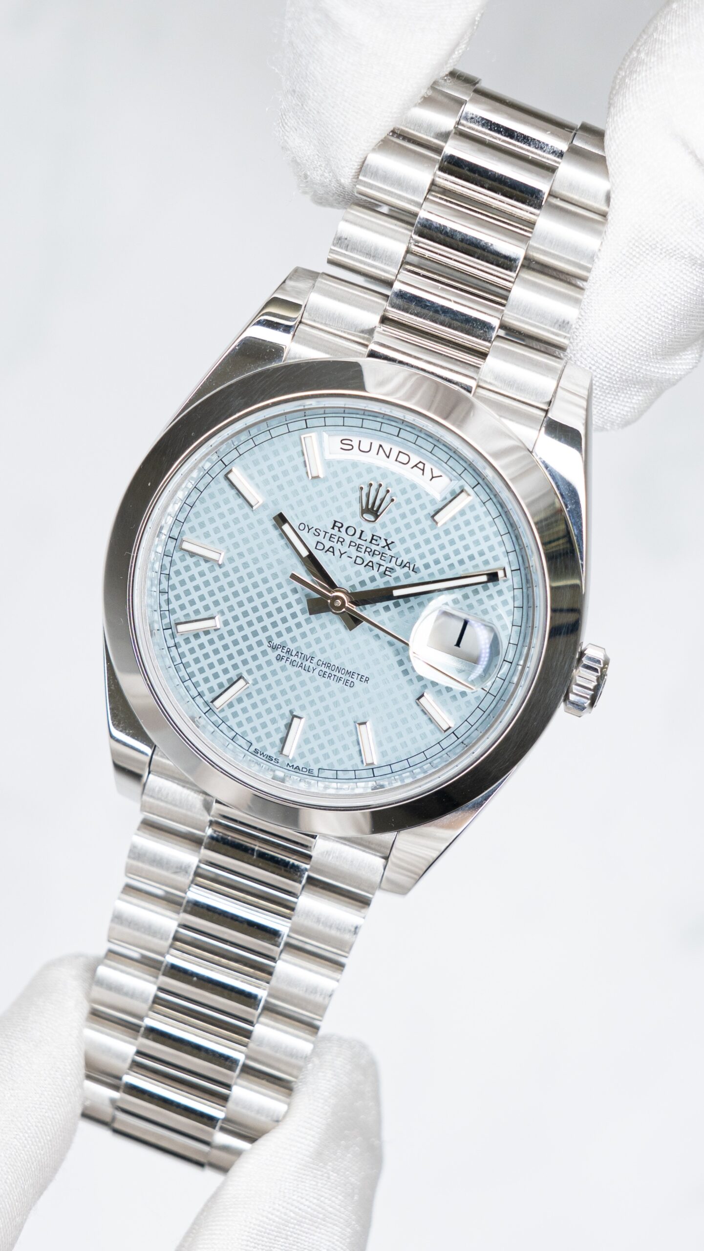 デイデイトのプラチナモデルに与えられる象徴が、アイスブルーダイヤル。これはロレックスの世界でも強い“素材の証明”で、同色が許されるのはプラチナだけ、という文脈で語られます。