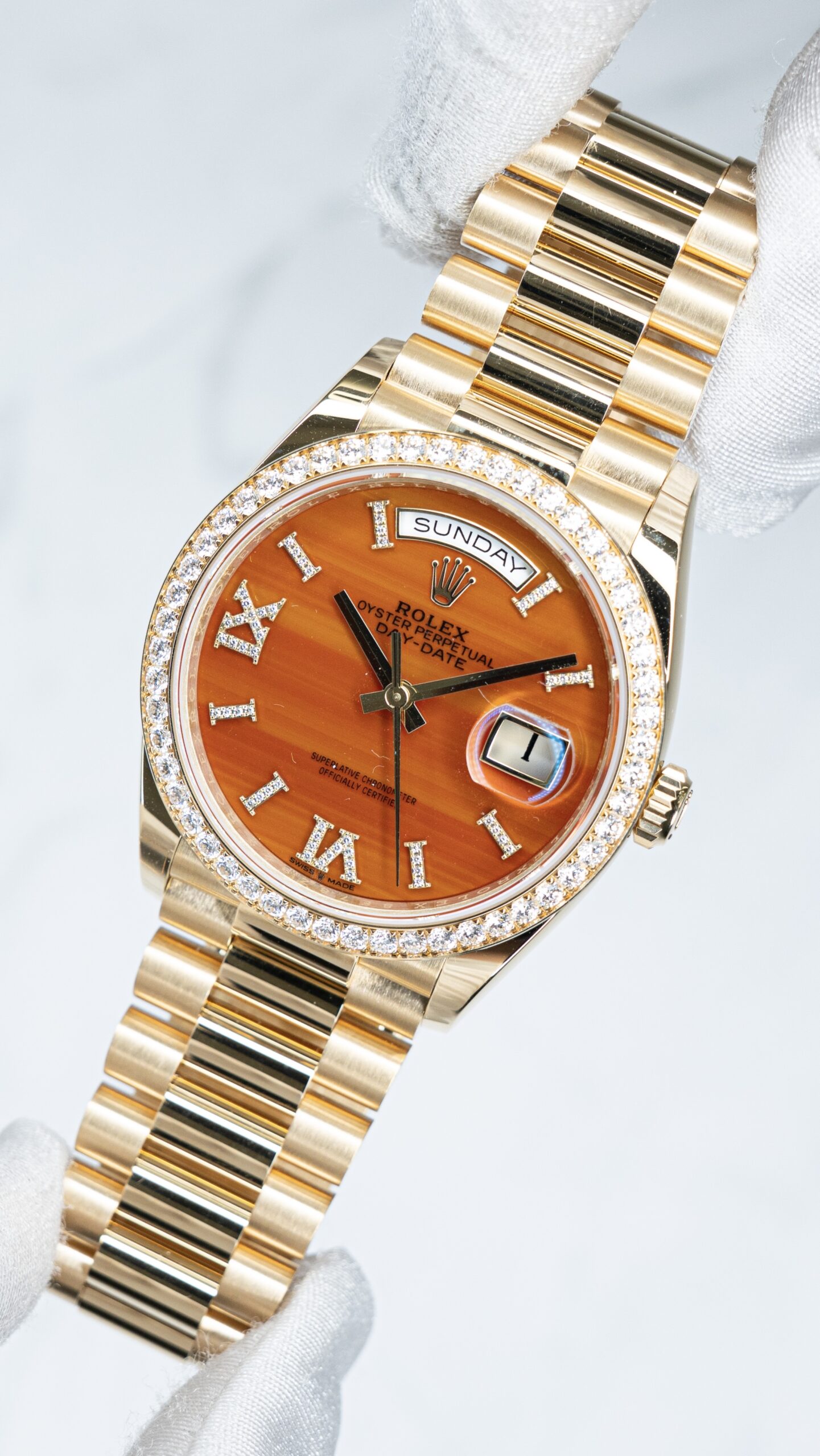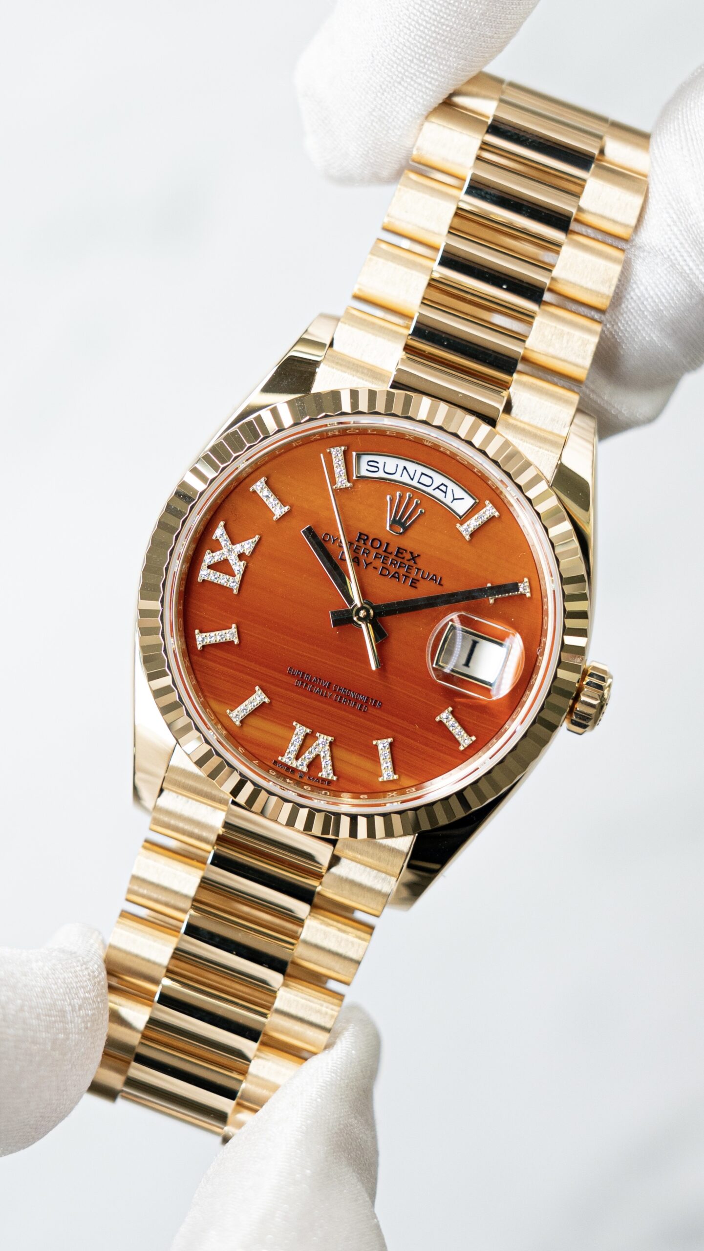 カーネリアン文字盤のデイデイトは、一般的なカラー文字盤とは別物です。天然石ならではの“揺らぎ”と、18ctイエローゴールドの艶が重なり、同じ型番でも個体ごとに表情が変わる——それが最大の魅力。ここでは 128348RBR(ダイヤ仕様) と 128238(フルーテッド仕様) を、仕様差と“選び方”まで含めて整理します。