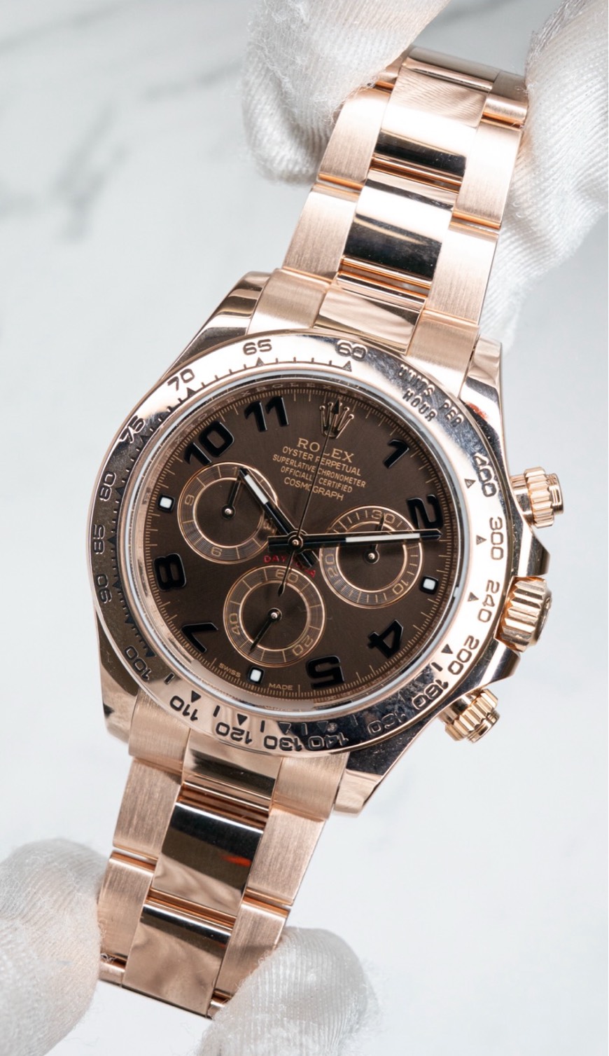 116505は、ケースもブレスもエバーローズの密度で押してくるタイプ。チョコアラビアの“甘い色気”が、軽さではなく「重みのある余韻」として残ります。流通上も “116505 Chocolate Arabic Dial” の個体が確認できます。