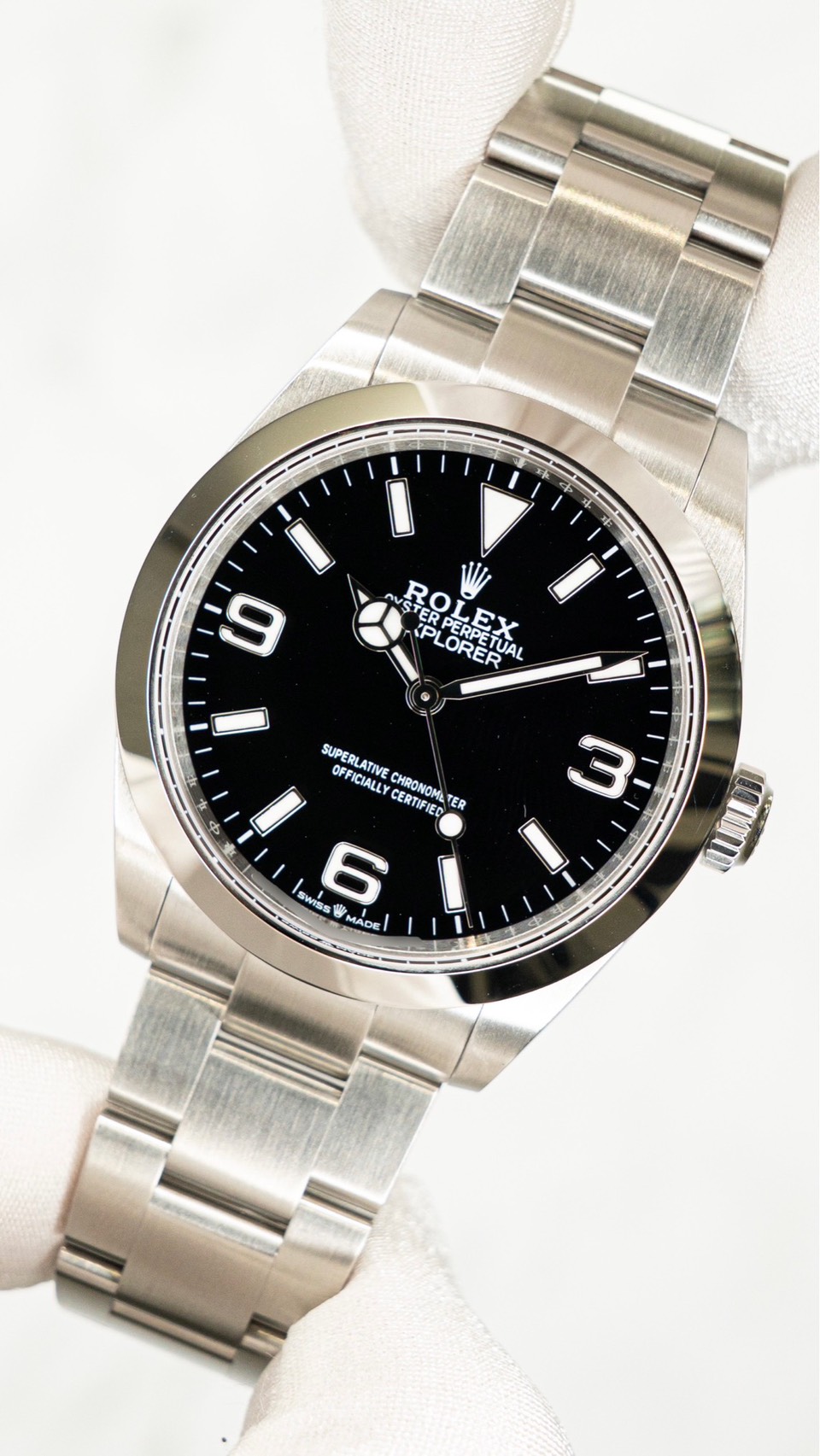 224270は、Explorerの哲学を40mmに落とし込んだ現行ど真ん中。公式スペックでも40mm/Oystersteel/Cal.3230/100m防水が明示されています。