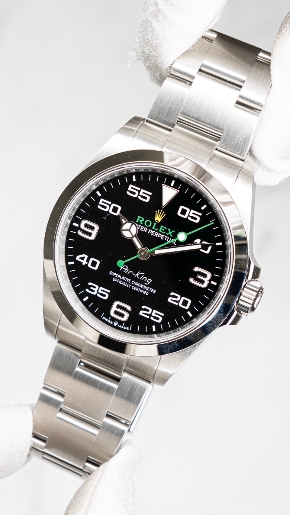 エアキング126900は、いわゆる「ロレックスの中で一番“顔が強い”黒」。黒文字盤をキャンバスにして、視認性とキャラクターを同時に取りにいきます。公式モデルとして現行は126900の1本体制です。