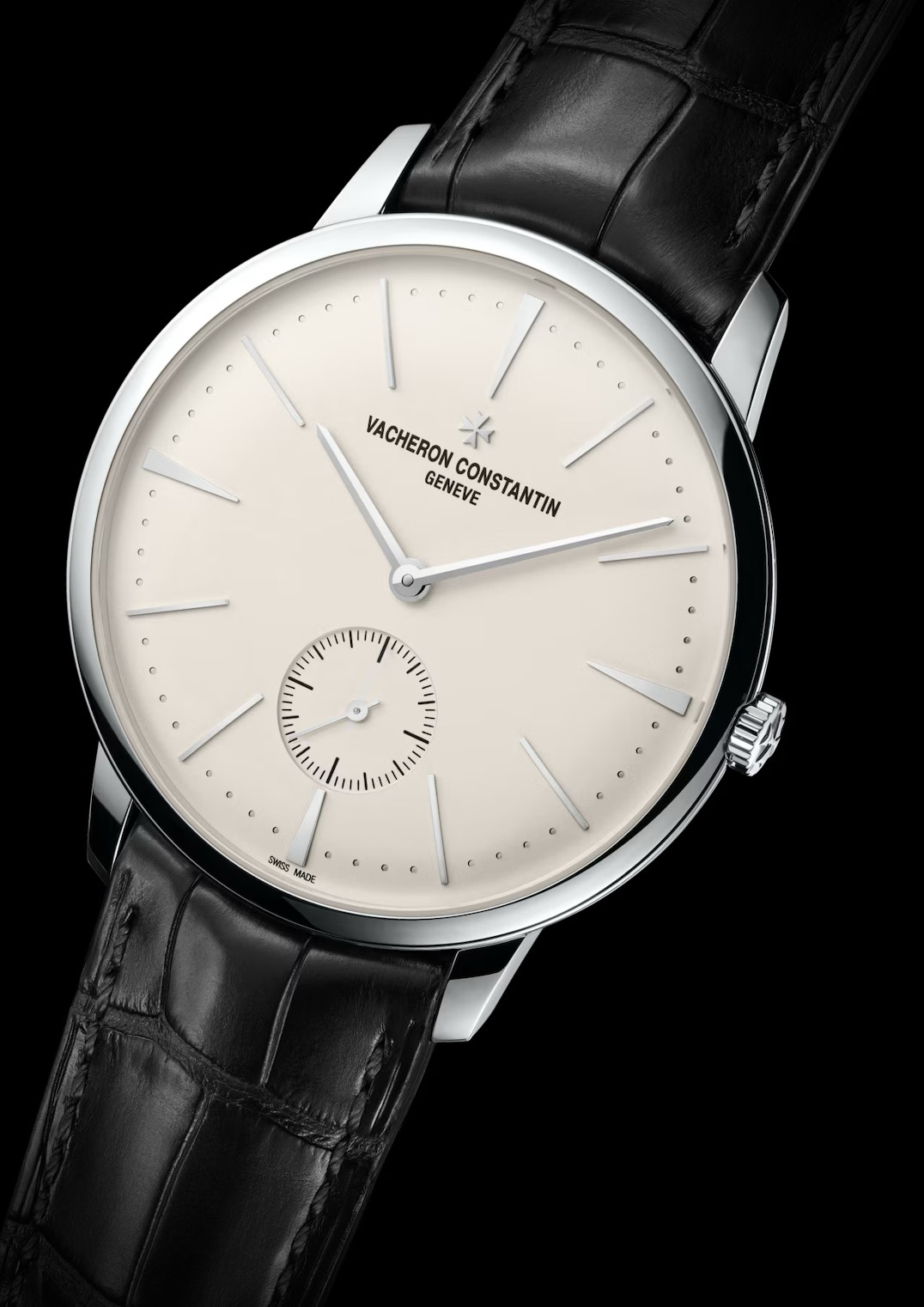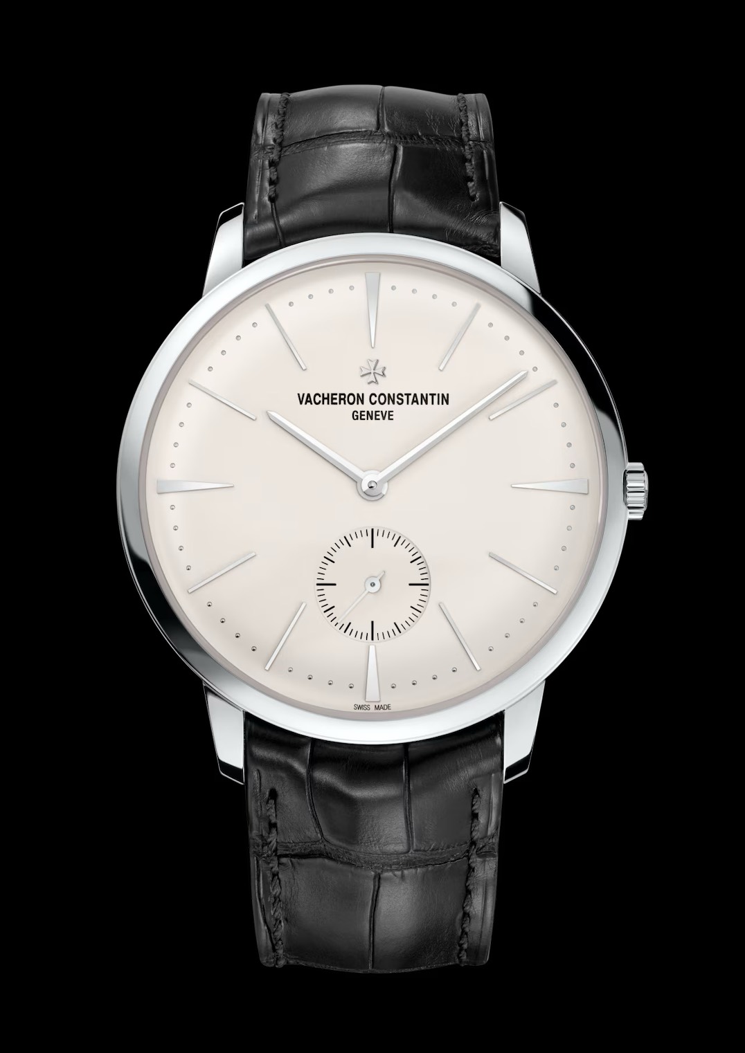 リファレンス 1110U/000G-B086 は、パトリモニーの“王道”をいく 18Kホワイトゴールド×手巻きのドレスウォッチです。直径 42mm/厚さ 7.65mm の薄型ケースに、スモールセコンド(6時位置)を備えた端正な2針+小秒の構成。文字盤はシルバートーンのオパーリン仕上げで、外周に“パール状”ミニッツトラックを配したクラシックな意匠が特徴です。
