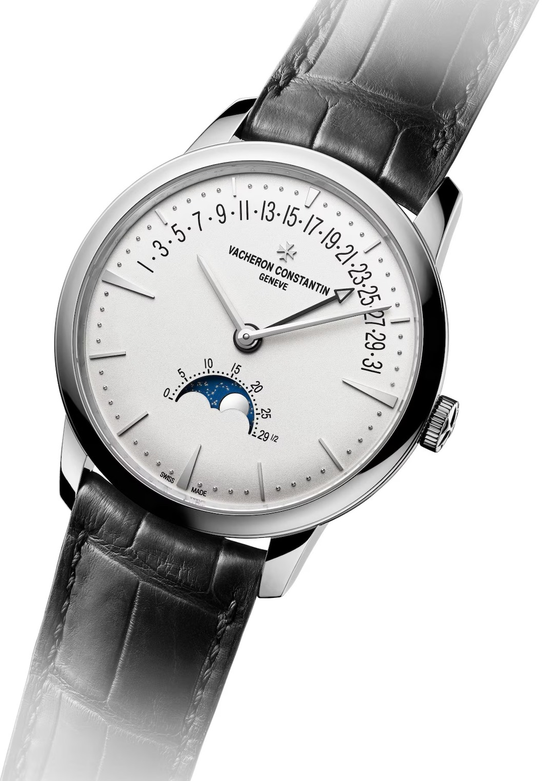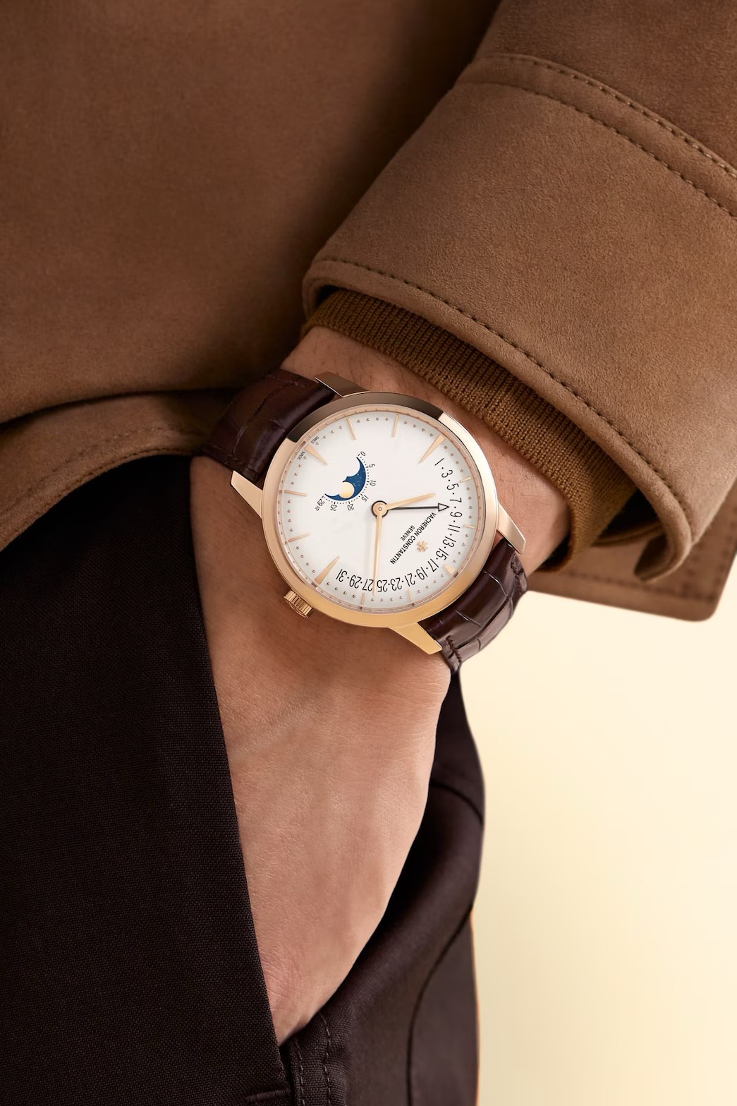 クラシックなドレスウォッチの理想形を、ムーンフェイズとレトログラード・デイトで“静かに”華やかにするのが、ヴァシュロン・コンスタンタン「パトリモニー ムーンフェイズ・レトログラード・デイト」。