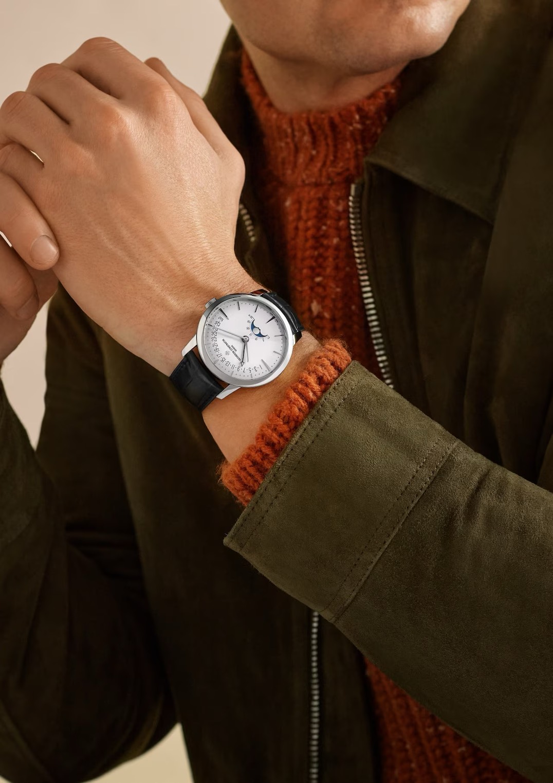 ムーンフェイズは、公式に「122年に一度の調整で良い」と説明される精密仕様。実用というより、着けるたびに気分を整えてくれる“詩的な機構”として効いてきます。