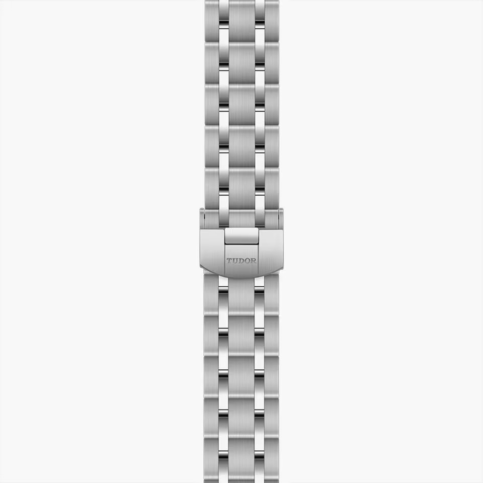 ブレスレットはスチール一体型の5列リンク(外側と中央がサテン、間がポリッシュ)で、光の当たり方が細かく変化します。