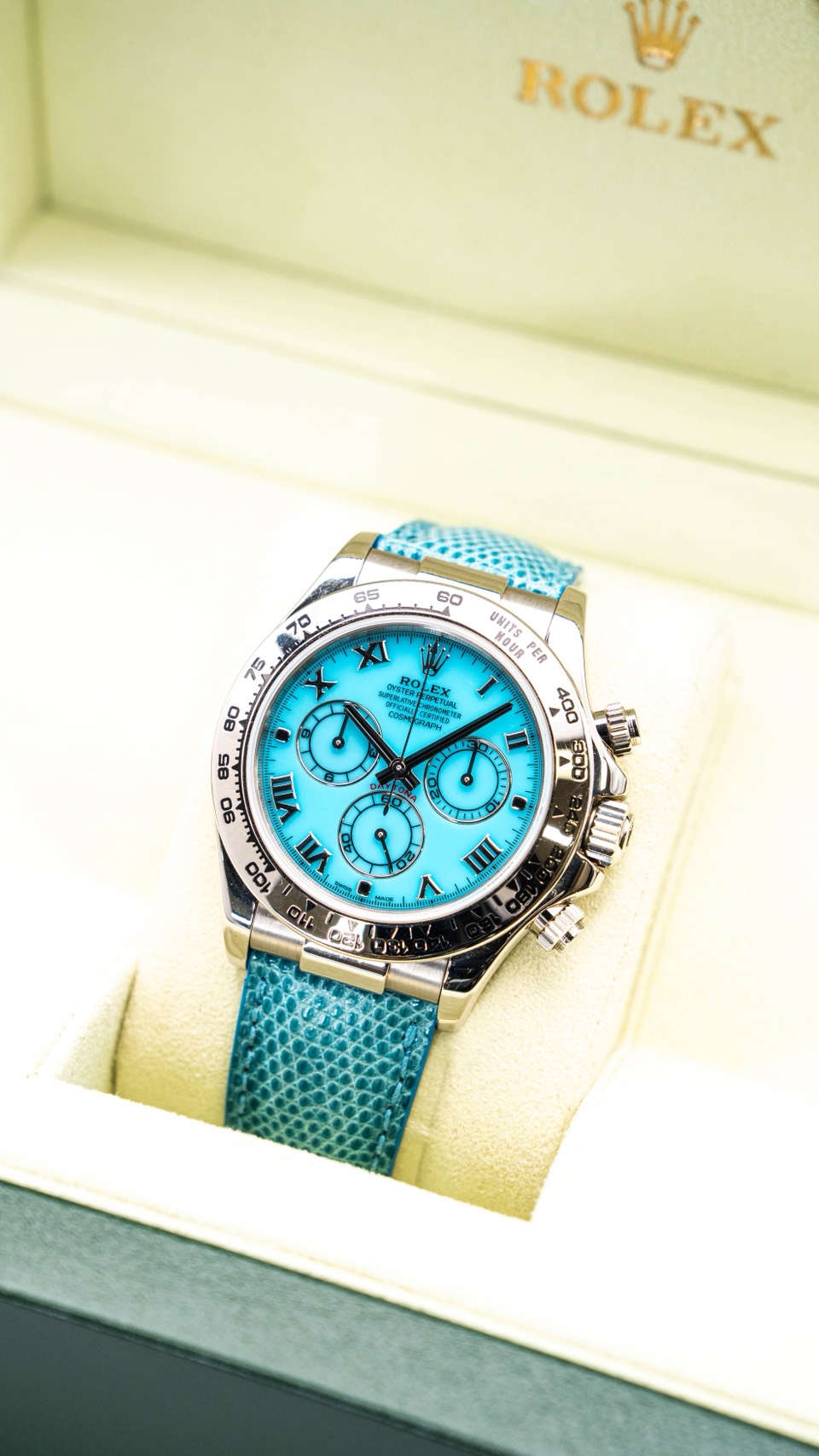 仕入れ・販売の肝は、文字盤/針/意匠の整合性と、ストラップ・付属品を含むトータルの完成度。ハマる顧客には、王道デイトナ以上に“刺さる理由”を用意できる──それが、このターコイズ・ビーチの強さです。