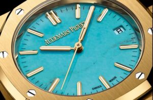 このモデルは、18Kイエローゴールド製のケースとブレスレットを持ち、文字盤には鮮やかなターコイズストーンが使用されています。サイズは37mm、厚さは約9.3mmと比較的スリムで、男女問わず装着しやすいバランスです。ロイヤル オークならではの八角形ベゼルとビスデザインが存在感を放ち、ターコイズの鮮やかさが腕元にラグジュアリーなアクセントを加えます。