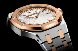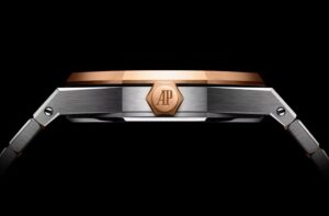 こちらは、ステンレススチールと18Kピンクゴールドを組み合わせたツートーンモデルで、ケースサイズは同じく37mm、厚さはややスリムな9mm。文字盤には「グラン・タペストリー」と呼ばれるロイヤル オーク特有の格子模様が施されており、シルバーのダイヤルとピンクゴールドのインデックスや針が上品に調和しています。