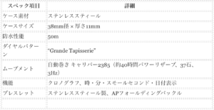 同じく38mmステンレススティールケース、防水50mを備えますが、文字盤はグレーの“Grande Tapisserie”パターンで、シルバー調のサブダイヤルと統一感のあるトーン。クロノグラフ機構付きキャリバー2385搭載で、スリークかつ落ち着いた印象を与える仕上がりです。