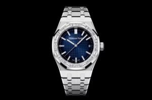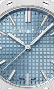 ライトブルーの“Grande Tapisserie”パターンダイヤルが目を引きます。ホワイトゴールドのアプライドインデックスと夜光付きロイヤルオーク針を備え、爽やかかつ上品な雰囲気をまとっています。