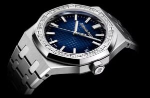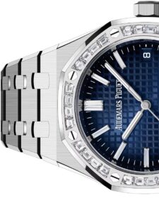 スモークブルーの“Grande Tapisserie”ダイヤルに、バゲットカットダイヤモンドのベゼル(32石・約1.66カラット)およびインデックス(12石・約0.24カラット)が豪華に配されています。白金製のロイヤルオーク針(夜光付き)を採用。