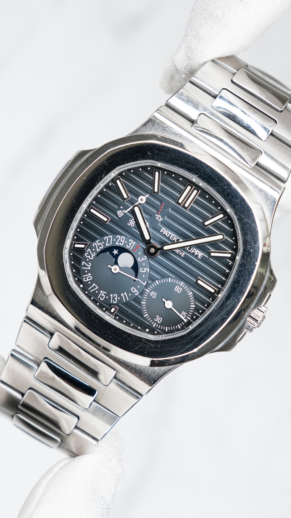 5712/1A-001は、薄型ムーブメントを土台に“複雑機構をエレガントに散らす”ことで、ノーチラスを静かな芸術品に寄せたモデル。