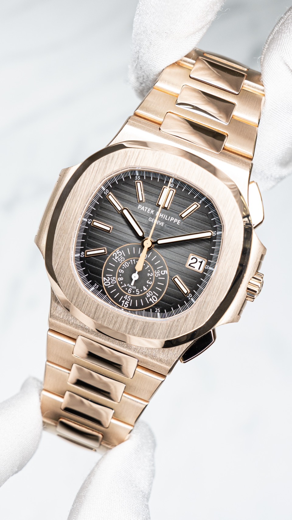 5980/1R-001は、フライバック・クロノとモノカウンターで“ノーチラスのスポーツ性”を最大化しつつ、ローズゴールドでラグジュアリーに振り切ったモデルです。