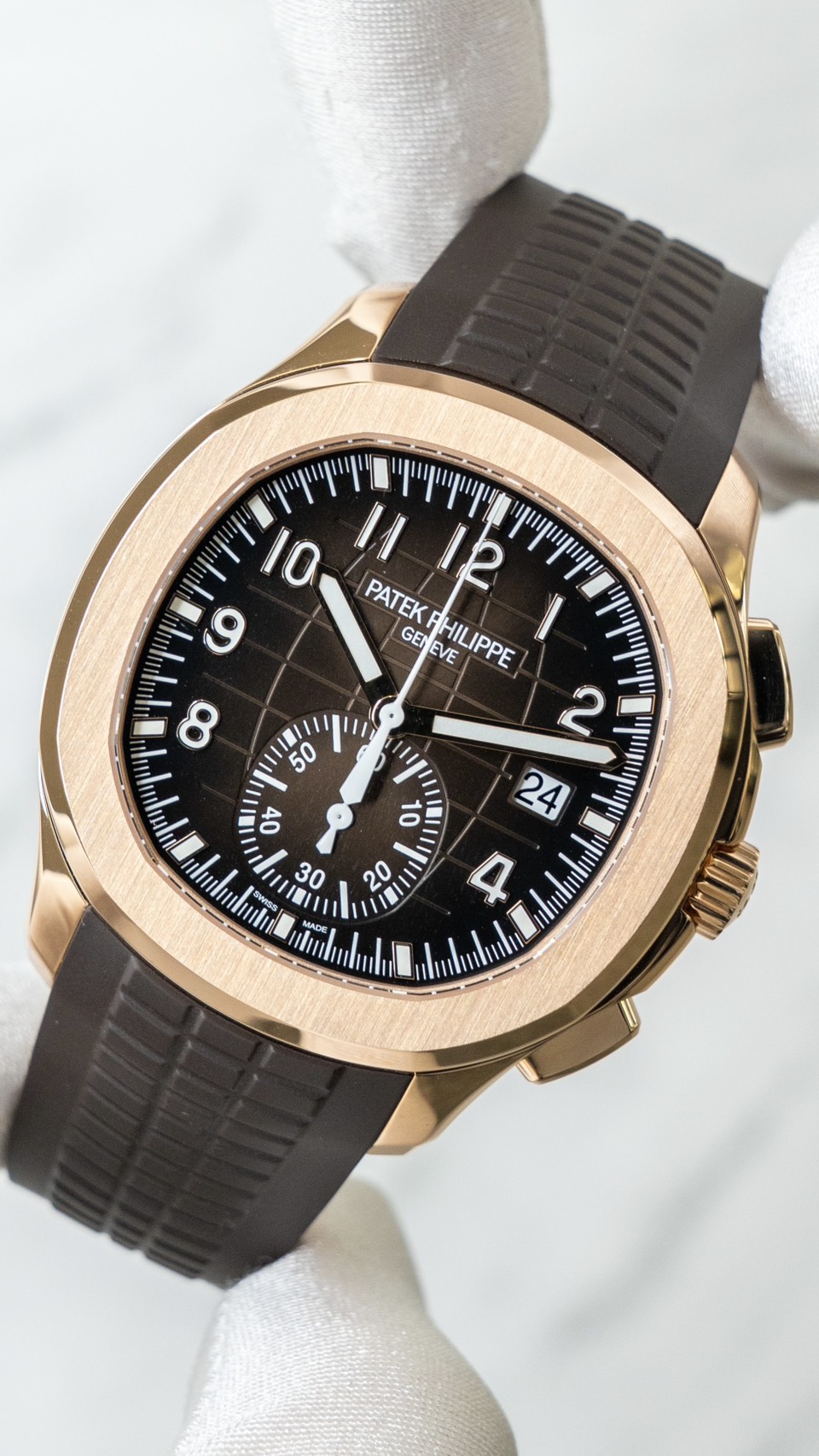 ダイヤルはサンバーストブラウン(アクアノート柄エンボス)。植字はローズゴールドで夜光入り。