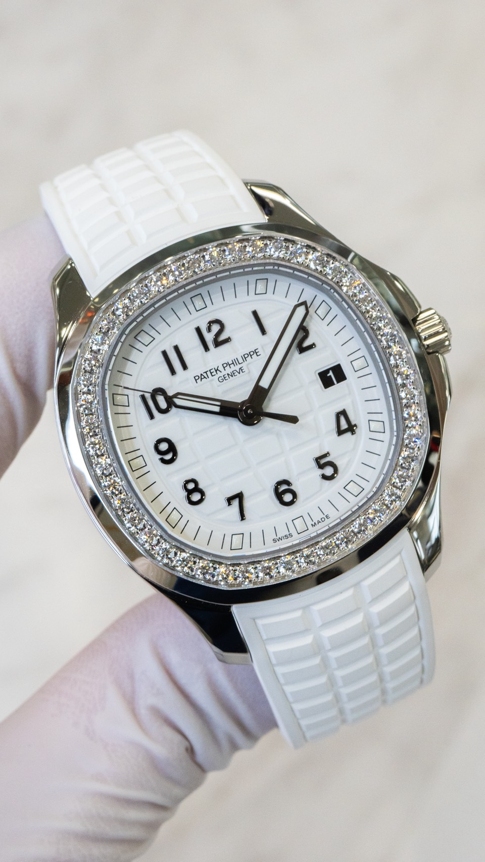 文字盤は**ホワイトMOP(マザーオブパール)**にアクアノート柄を彫り込み、バゲットカットのマルチカラーサファイアをインデックスとして配置。華やかさの中に、パターンとバゲットの直線が“スポーティな芯”を残します。
