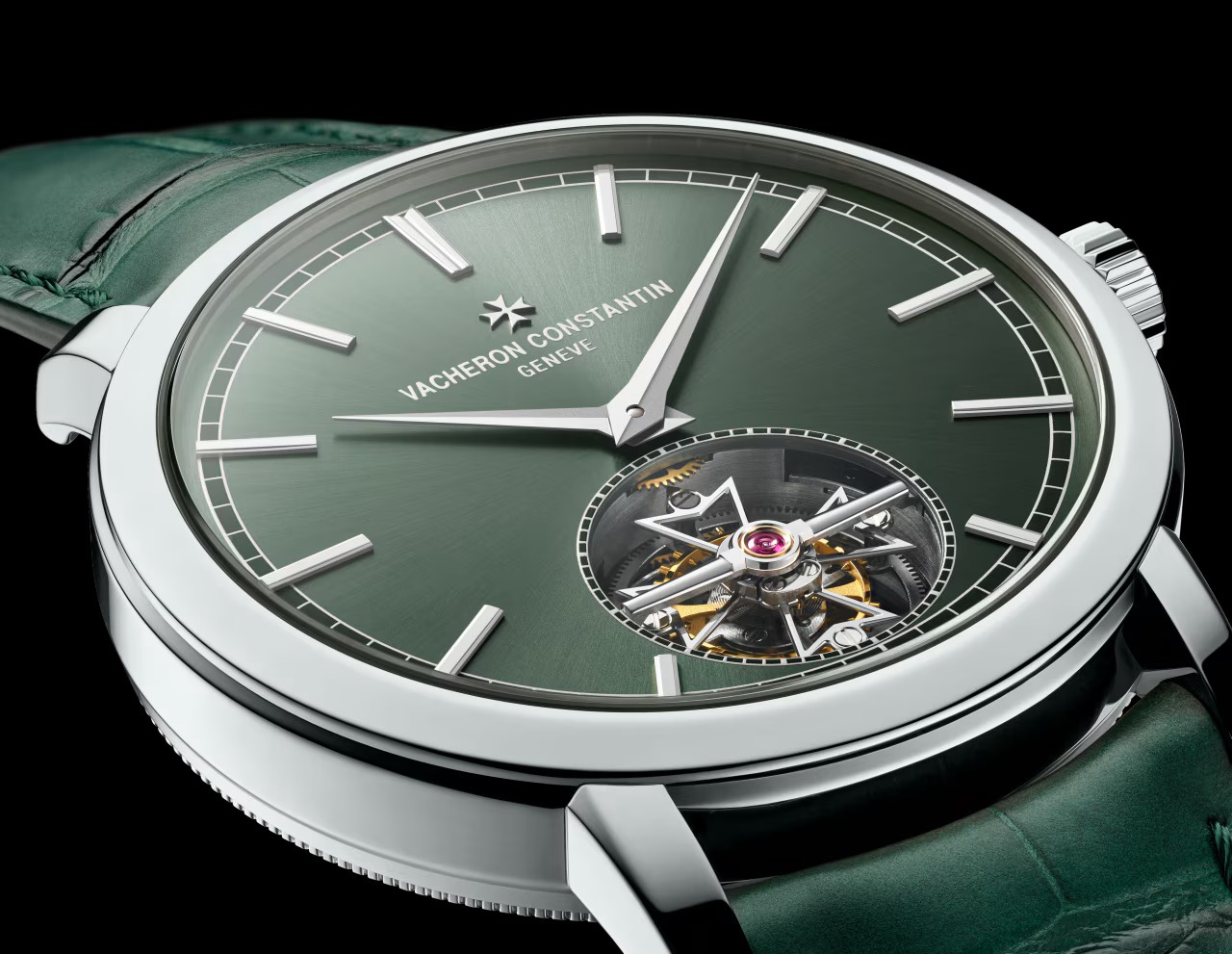 ストラップはグリーンのアリゲーターレザー、バックルは**トリプル・フォールディング・クラスプ(素材:950プラチナ)**です。